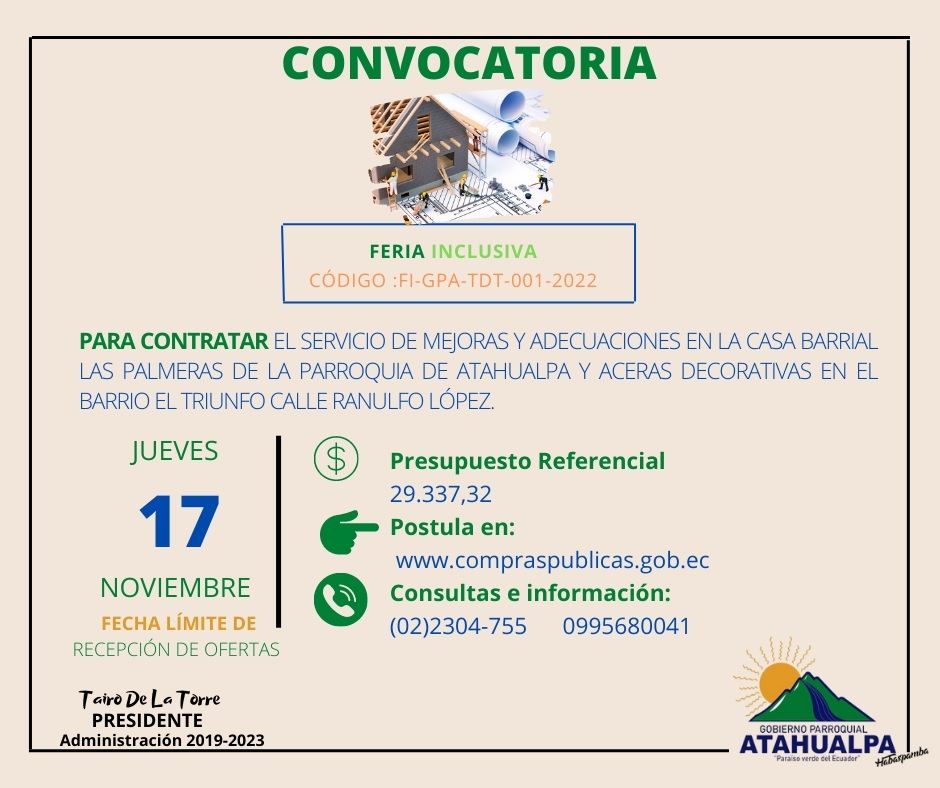 #AtahualpaEsMejoras | El GAD Parroquial, invitan a todas las personas que oferten el servicio de Mejoras y Adecuaciones postalar en la #FeriaInclusiva para adquisición de este servicio.